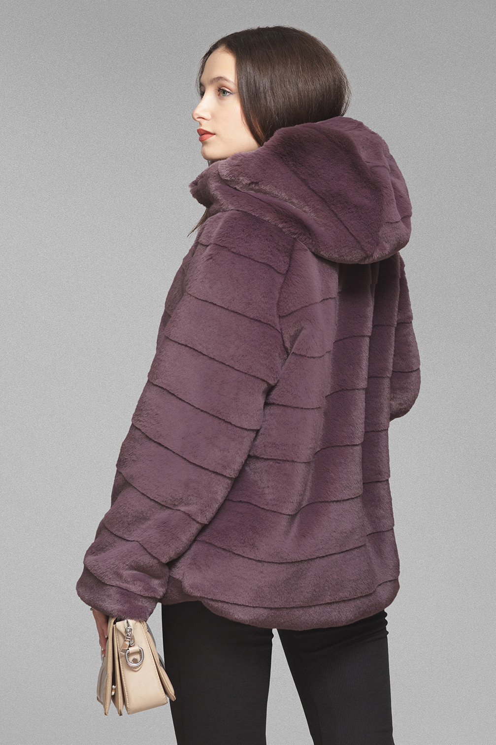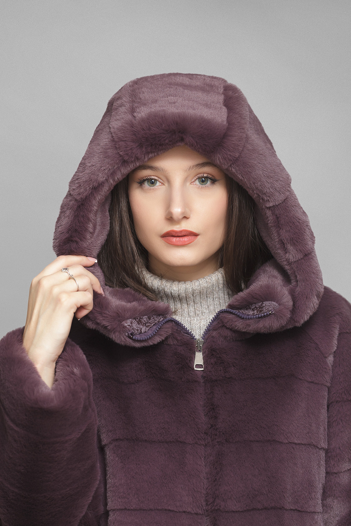 Меховая женская куртка прямого силуэта с уютным капюшоном, притачным поясом и рукавами, присобранными на эластичную тесьму. Детали изделия: застёжка на мол...