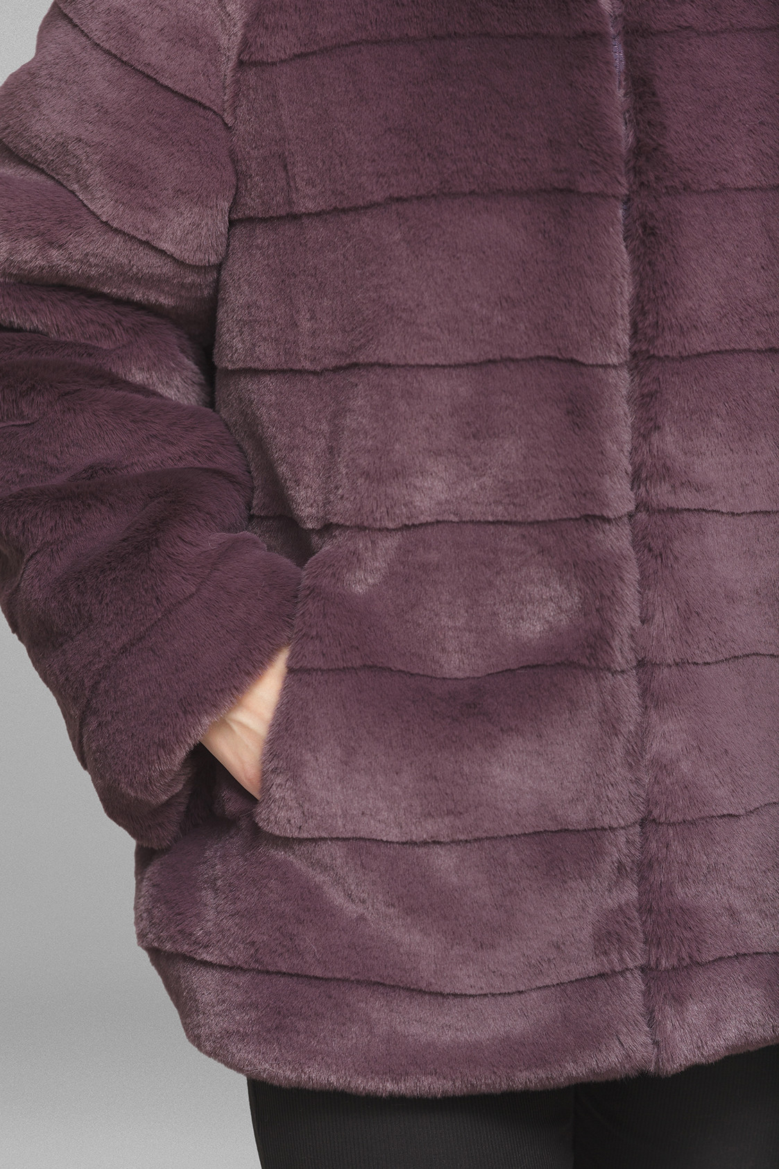 Меховая женская куртка прямого силуэта с отрезными лацканами, регулировкой низа за счёт резинки с фиксаторами и рукавами реглан, присобранными на эластичну...