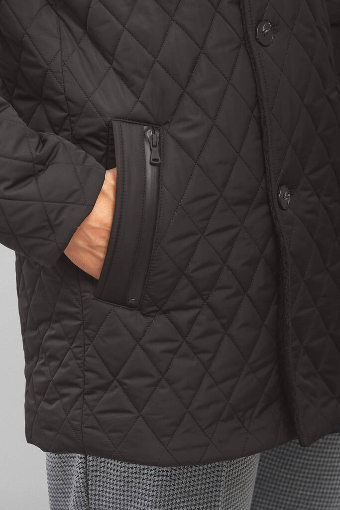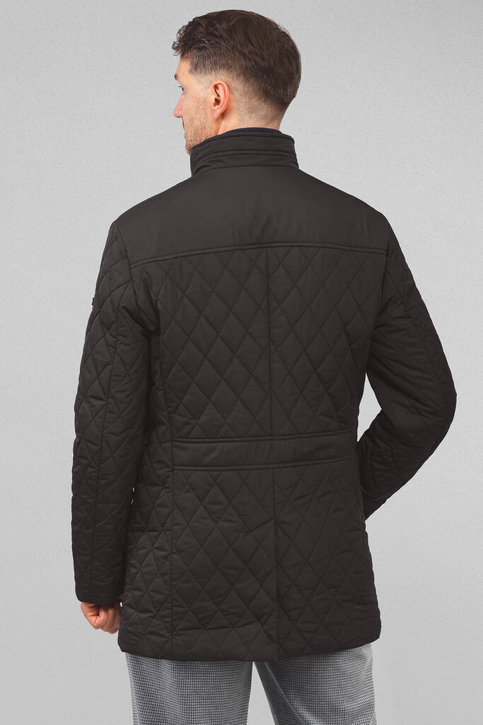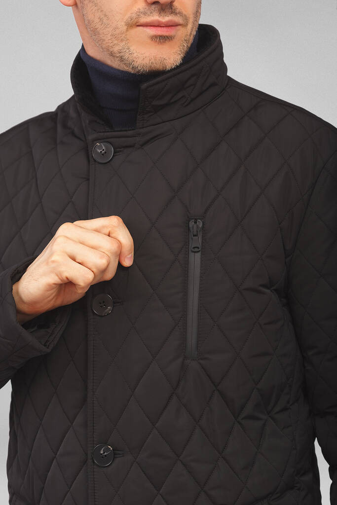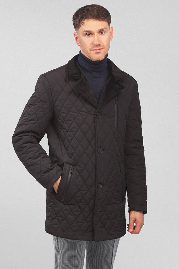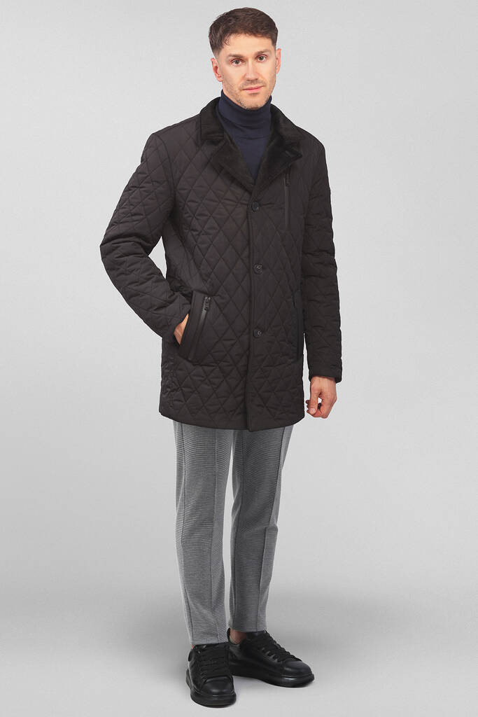 Утеплённое мужское пальто из плащевой ткани с ромбовидным рисунком стёжки, дополненное декоративными молниями и отделкой из искусственного меха. Детали изделия: застёжка на четыре пуговицы, два боковых кармана с листочками, дополнительный карман на молнии, одна шлица.