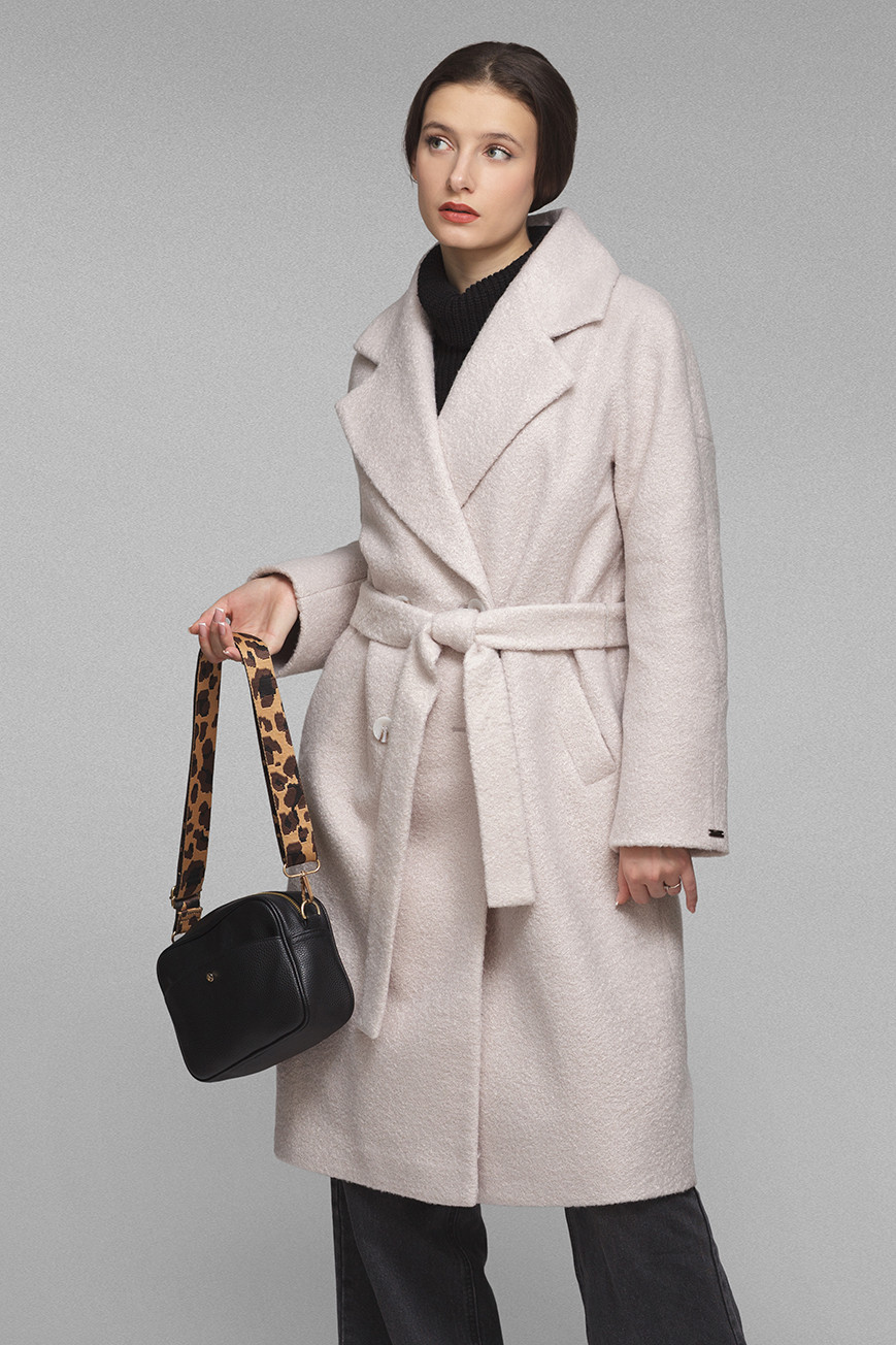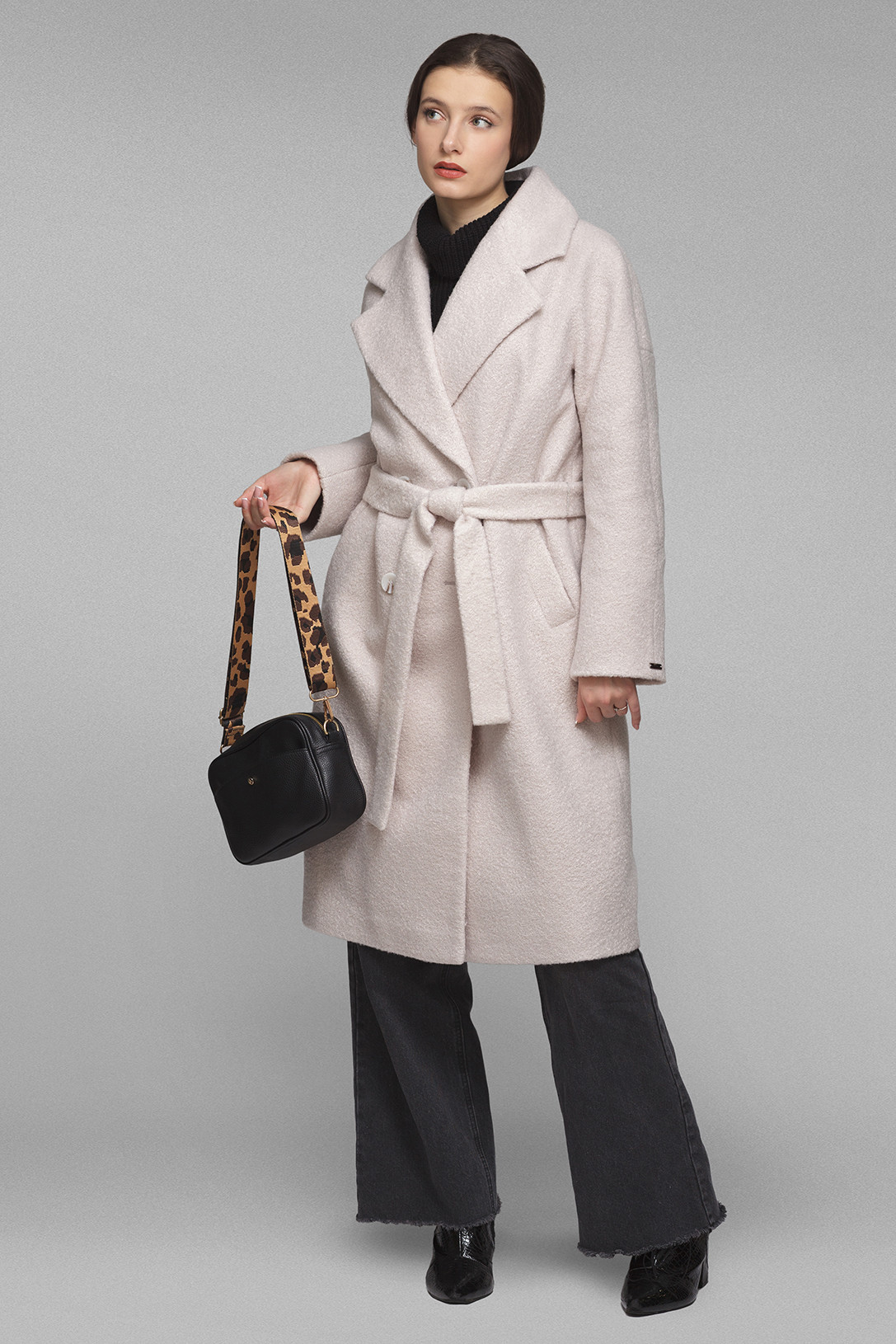 Классическое женское пальто прямого силуэта из драповой ткани со спущенным плечом рукава, отложным английским воротником и лацканами, дополненное поясом в ...