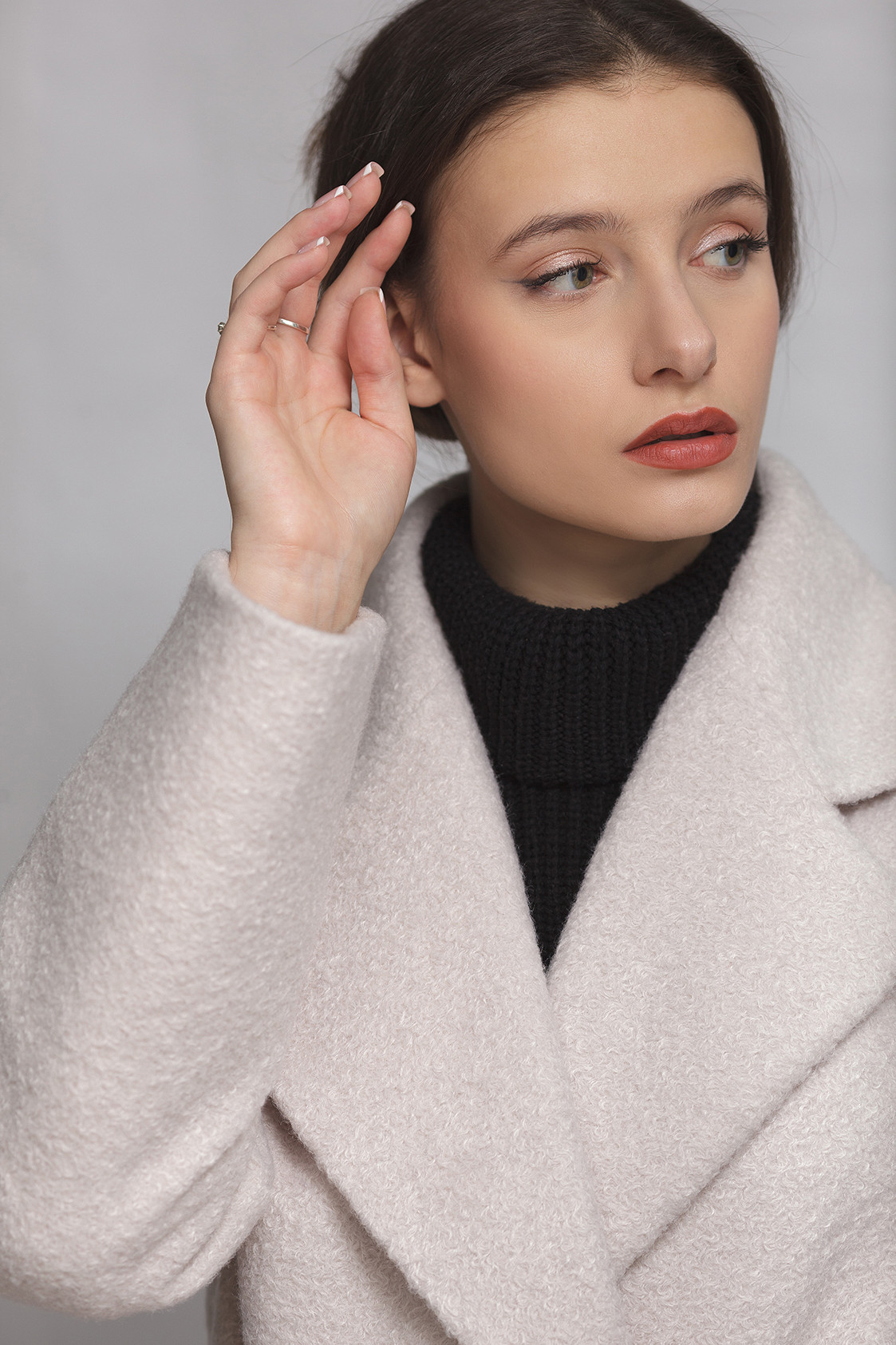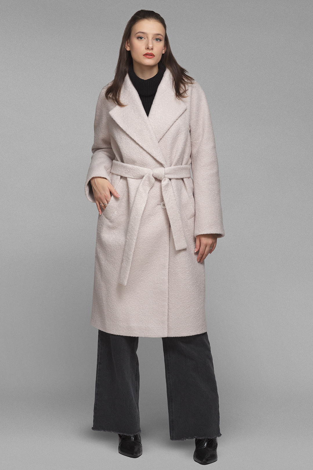 Классическое женское пальто прямого силуэта из драповой ткани со спущенным плечом рукава, отложным английским воротником и лацканами, дополненное поясом в тон. Детали изделия: смещённая застёжка на пять пуговиц, шлица внизу спинки, боковые карманы с листочками.