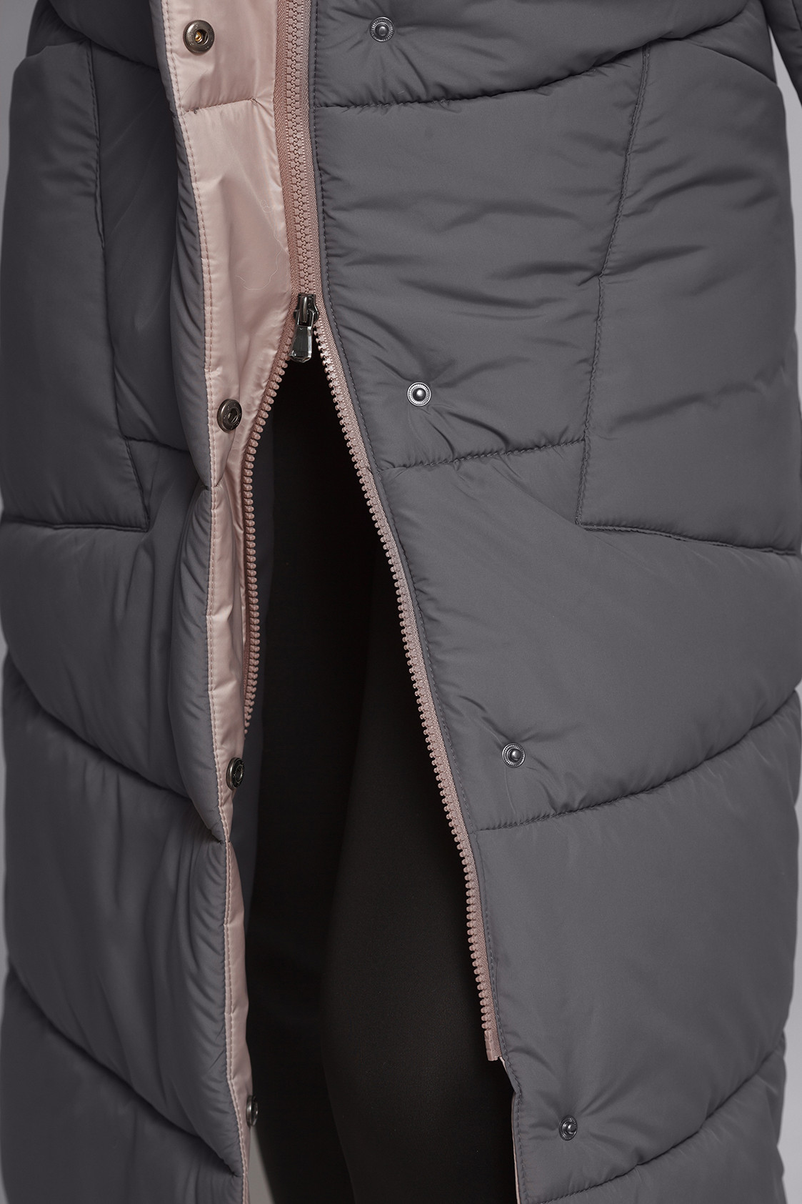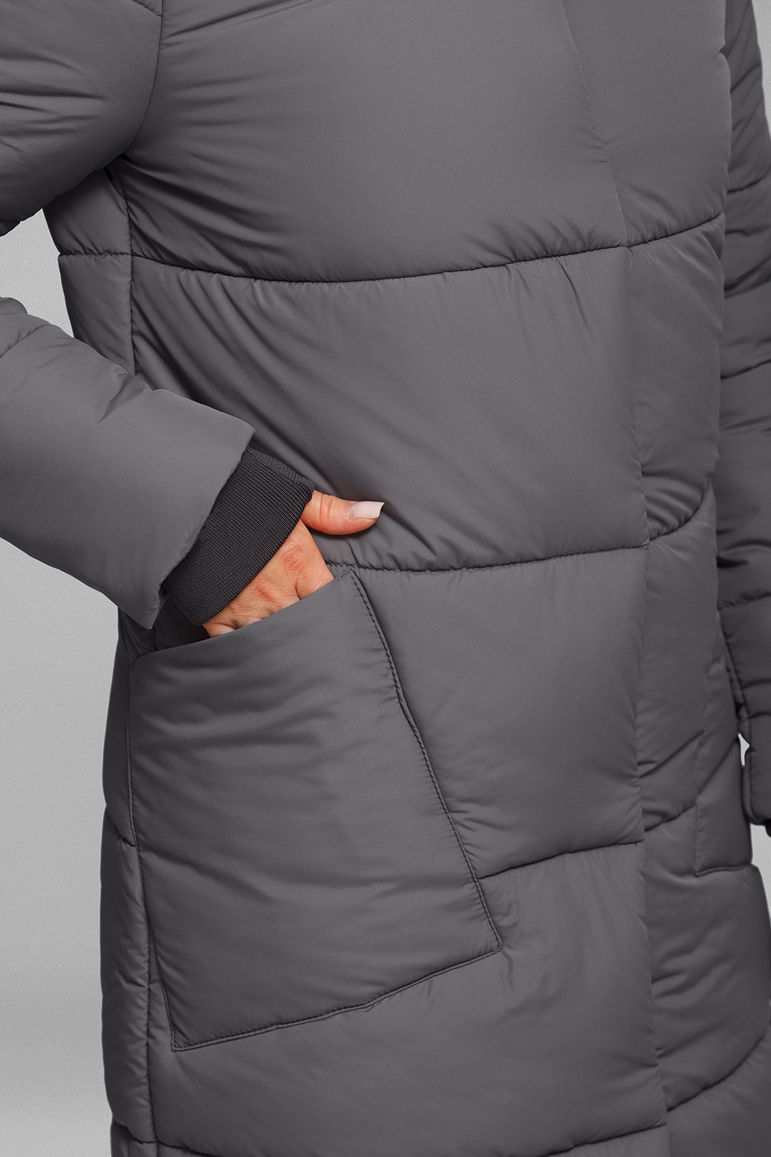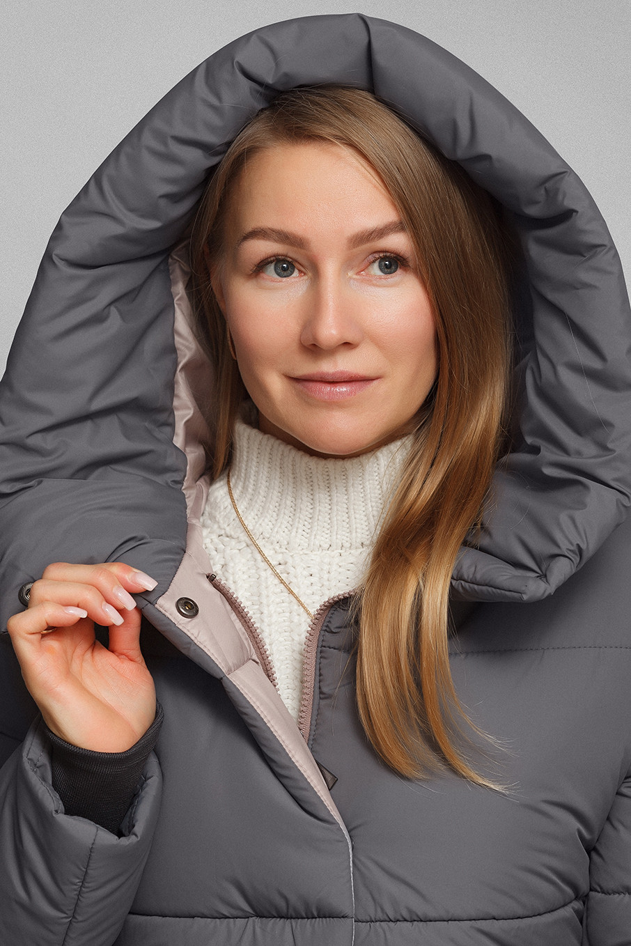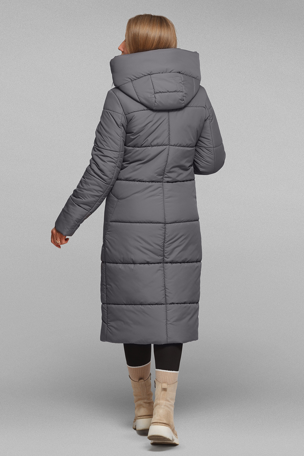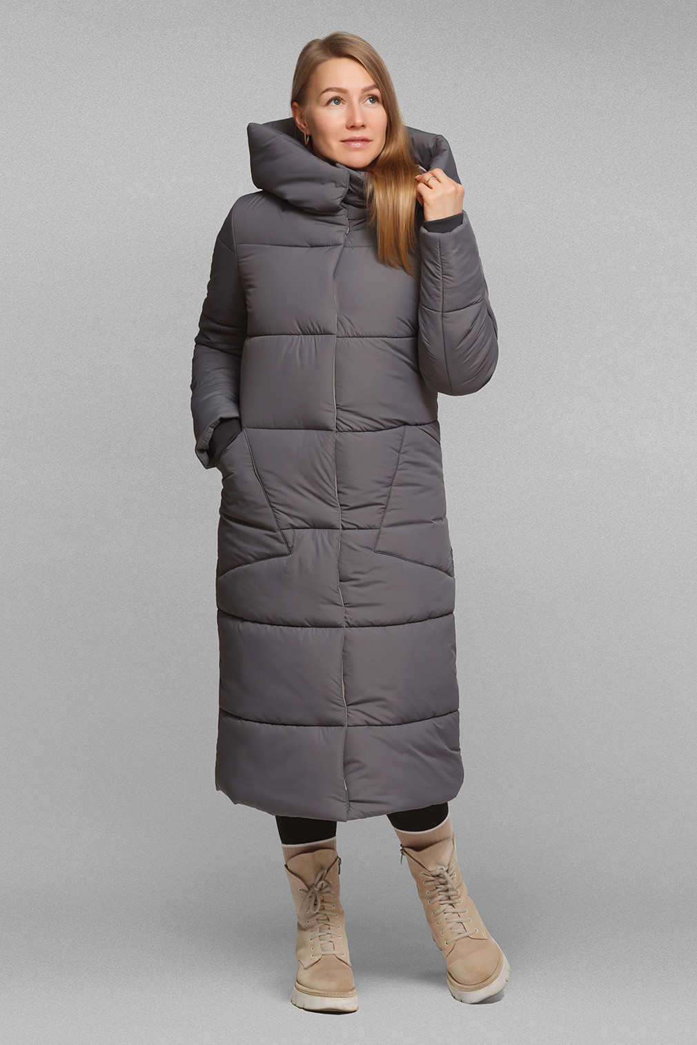 Женское пальто прямого силуэта с центральной застёжкой на молнию с планкой на семь потайных кнопок, боковыми накладными карманами и втачным капюшоном.